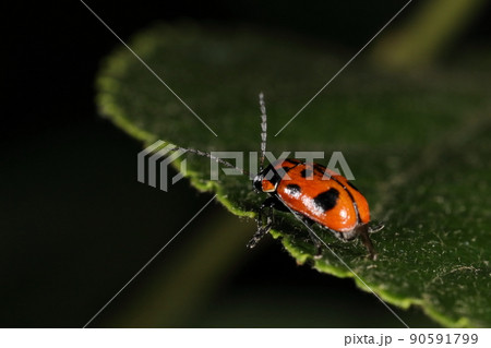 生き物 昆虫 クロボシツツハムシ、体長五ミリほど。赤い地色に黒い点々のずんぐりした体