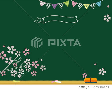 イラスト素材: 入学式に黒板にチョークメッセージ。桜吹雪。