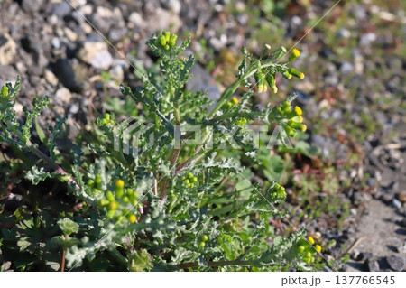 早春の道端に咲く黄色で花びら(舌状花)のないノボロギクの花