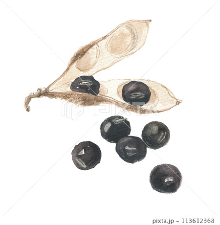 水彩で描いた 黒豆と鞘