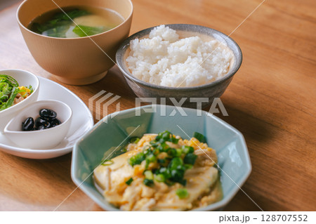 和食の朝ごはん、白ご飯と味噌汁付きの健康的な食事