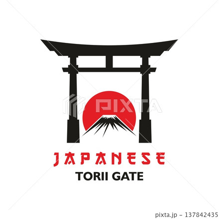 Temple entrance Japanese Torii gate and mountain peak icon. Minimalist emblem featuring Torii gate, Mount Fuji with rising sun behind it. Red black vector symbol for travel agency
