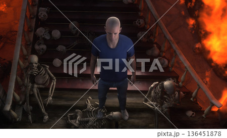 Man in hell. Sinner. A lonely sinfull man stands in front of a hell gates. Hell fire. Religious concept. 3d rendering.