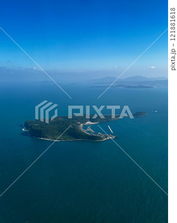 福岡県の玄界灘上空から望む相島と新宮町、古賀市方面のパノラマ