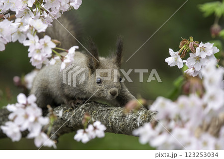 桜の木でたたずむエゾリス