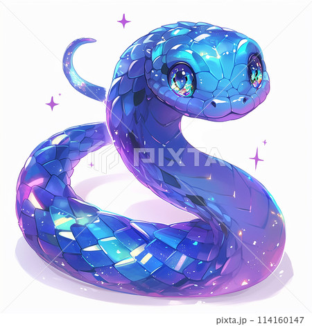 2025 blue snake with blue eyes and a purple tail. The snake is surrounded by stars and has a glittery appearance