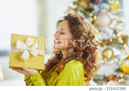 Pure Joy: Woman Celebrates Christmas with Golden Gift