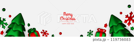 Happy New Year and Merry Christmas. Christmas holiday background with realistic 3d objects,green and white bauble balls, conical metal stars. Levitation falling design composition.