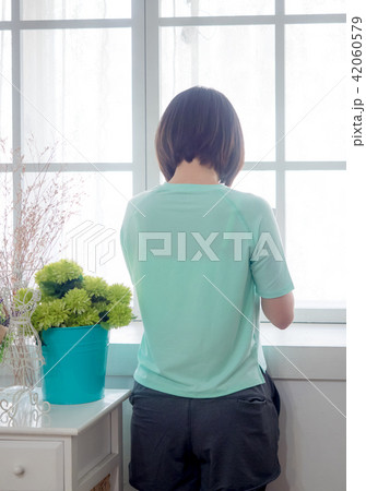 Picture of lonely old woman sitting on the wheelchair while looking at sunlight.