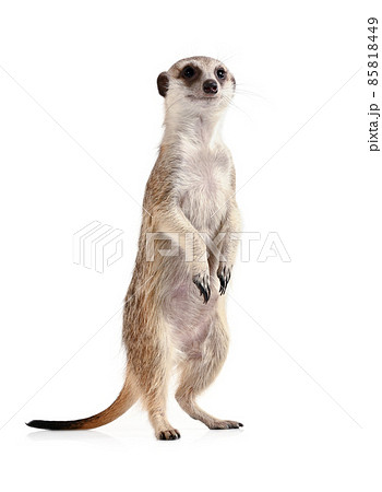 Meerkat, Suricata suricatta, on hind legs. Portrait of meerkat standing on hind legs with alert expression. Portrait of a funny meerkat sitting on its hind legs.