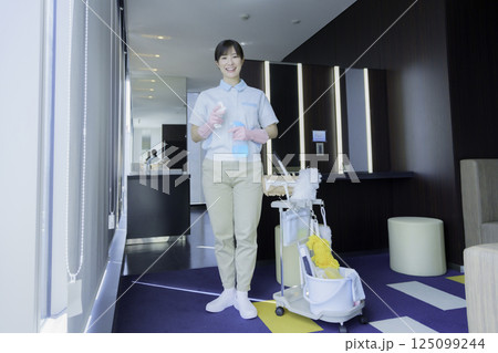 オフィスビルの若い女性清掃員の全身のポートレート 撮影協力:学校法人電波学園 東京電子専門学校