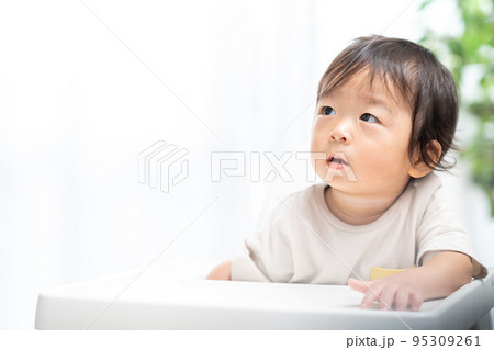 ベビーチェアに座る幼児の男の子。