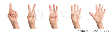 Counting hand gestures. Wrinkled elderly human hand showing numbers one to five, gray skin tones,