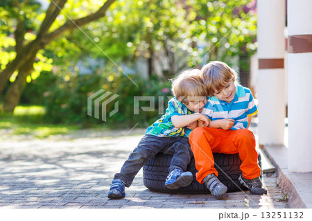 Two little sibling boys hugging and having fun outdoors