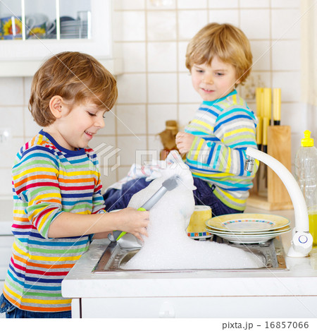 Two little blond kid boys washing dishes in domestic kitchen