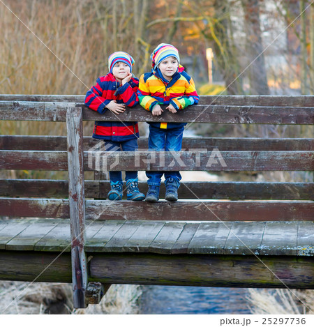 Two little brothers children in colorful clothing walking hand i