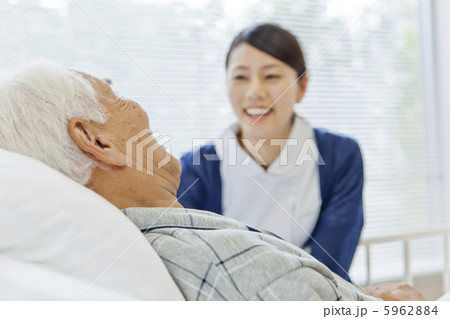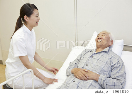 笑顔で看護師と会話するシニア男性