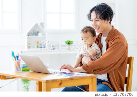 リビングの机で赤ちゃんをあやしながらノートパソコンで仕事をする20代から30代の男性