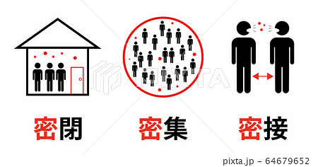 ロナウイルス予防の避けるべき3密、密閉空間、密集空間、密接空間のイメージ図