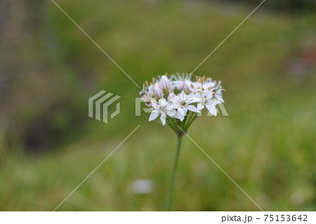 ニラ 花茎の先に白い小さな花をいくつも咲かせている。横長の写真