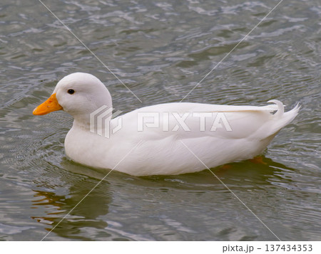 White domestic duck swimming on pond water(池を泳ぐ白いア