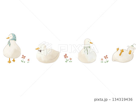 水彩風のかわいいアヒルたちの総柄パターンイラスト