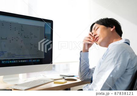 パソコンの前で疲れた表情の男性電気系エンジニア