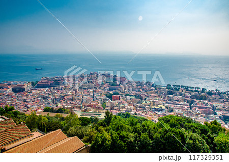 南欧イタリア共和国カンパニア州ナポリ県 ナポリ湾船上から望むヴェスヴィオ火山と麓の街並み