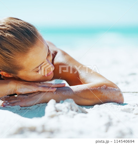 Happy young woman in swimsuit relaxing while laying on sandy bea