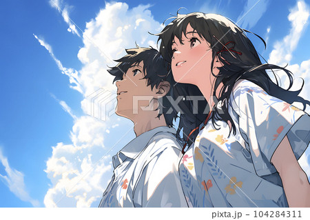澄んだ青空を眺める2人の高校生の男女(AI生成画像)