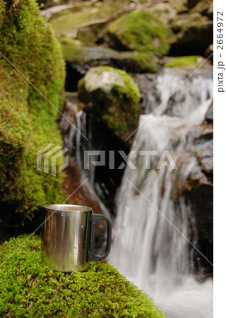 湧水地から流れ出す水とカップ