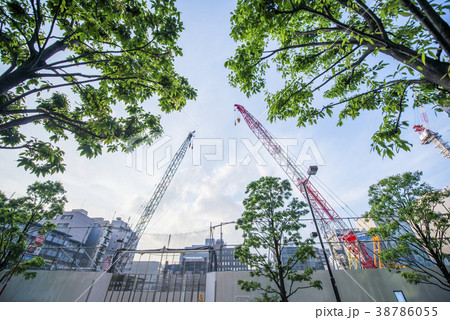 建設中の工事現場と街路樹の緑