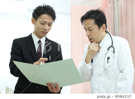 医師と打ち合わせするビジネスマン
