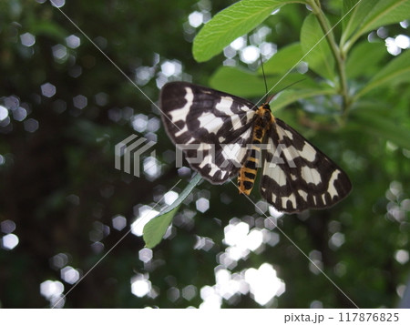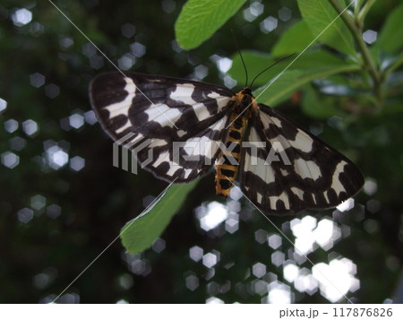 菊池渓谷で羽を広げて止まる白黒のコミスジ蝶