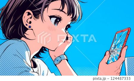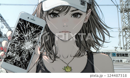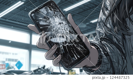 画面が激しく割れているスマートフォンを手にしているいる若い女性