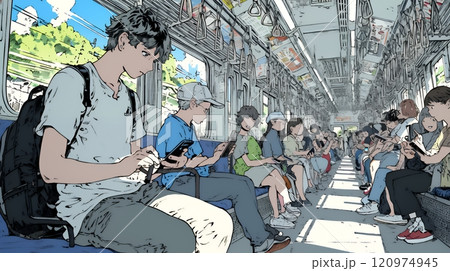 コンピューターと人間の交流:人がデバイスを操作する、情報交換の様子。漫画風。