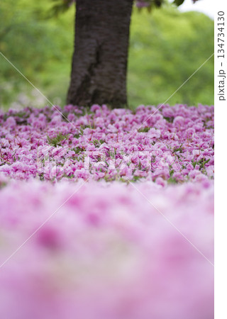 公園のサトザクラ(里桜)の花が散って地面がピンク色の絨毯のようです。学名はPrunus serrul