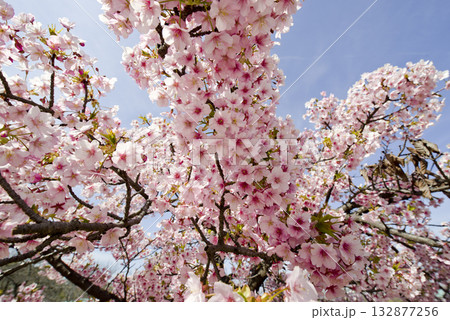 青空の下、公園の桜の花が満開でとてもきれいです。桜の名前はカンヒザクラ(寒緋桜)です。