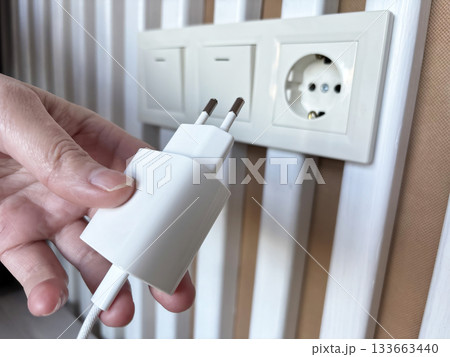 Hand plugging a phone charger into a wall socket, connecting power adapter at home, charging mobile device, everyday technology use and modern lifestyle concept