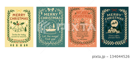 クリスマスベルとリボンと柊の水彩画イラスト素材