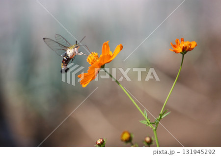 日本の秋の野原に咲くキバナコスモスの蜜を吸うオオスカシバ