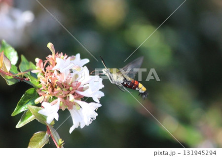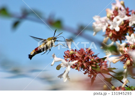 生き物 昆虫 オオスカシバ、口吻をたたんで次の花に一直線