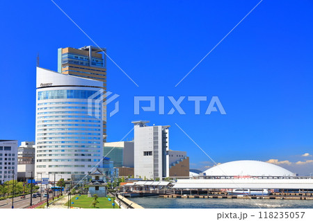 日本の横浜都市景観 初入港。新港ふ頭客船ターミナルのバイキング・エデンなどを望む=19日