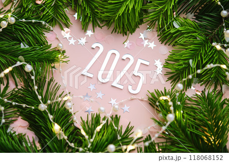 New Year 2025 pink background. Number of the coming year in Christmas decoration.