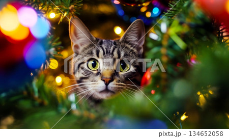 Adorable grey cat muzzle peeking through a decorated Christmas tree with colorful garland lights. Surprised cute tabby feline pet is ready for the winter holidays, surrounded by festive decorations.