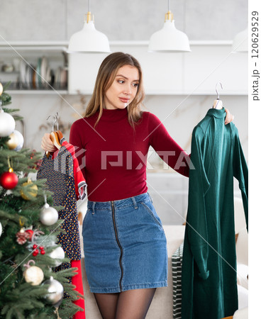 Upset woman not happy with her old dresses in wardrobe for Christmas celebration in apartment