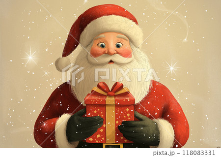 頬を赤らめ、肩にはプレゼントの入った袋をかけ、温かみのあるサンタクロース
