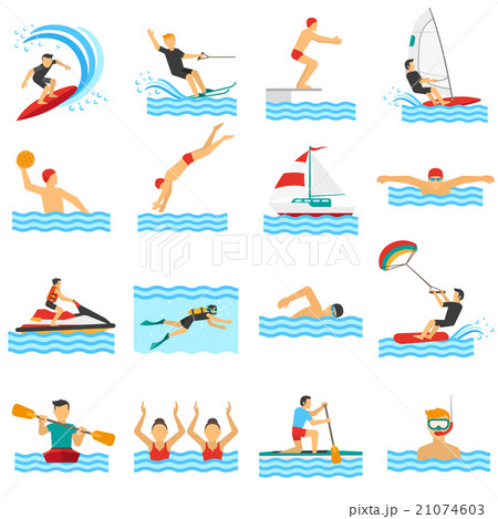 Water sport. Active extreme recreation. Sailing, parasailing, scooting, surfing, skiing. Happy sportive people scene set isolated on white background. Tourism on summer vacation. Vector illustration