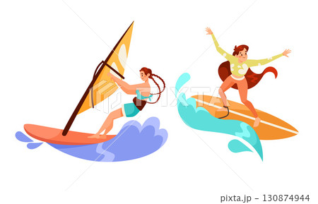 People surfing and windsurfing, set of cartoon characters isolated on white, vector illustration