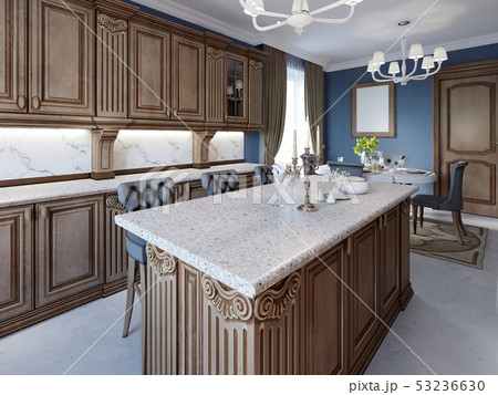 Luxurious traditional kitchen featuring rich dark wood cabinets, white marble island, gold accents on faucet and hardware. Glass globe pendants illuminate space, perfect for high-end home design